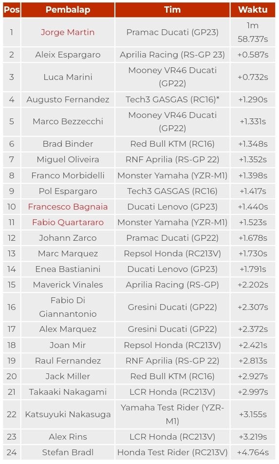kali ini catatan lapnya selisih hanya 1,074 detik dari catatan Bagnaia saat memenangi GP Malaysia tahun lalu. Akan tetapi Pembalap nomor satu MotoGP 2022 tersebut tidak mempertajam waktu putarannya pada sesi hingga tengah hari.